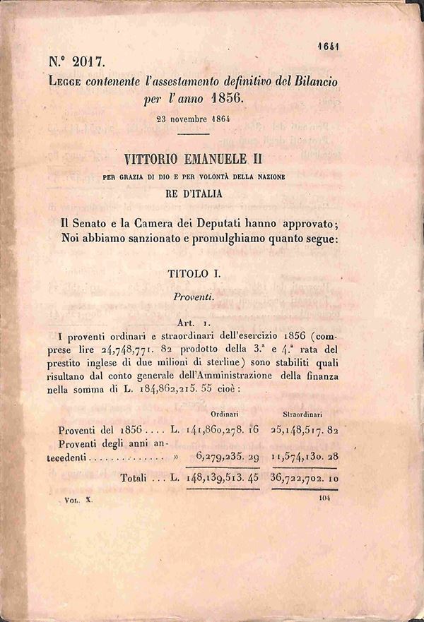 1864 (23 novembre) - Leggi di assestamento dei bilanci del 1856 e 1857 (in sedicesimo - non tosato)
