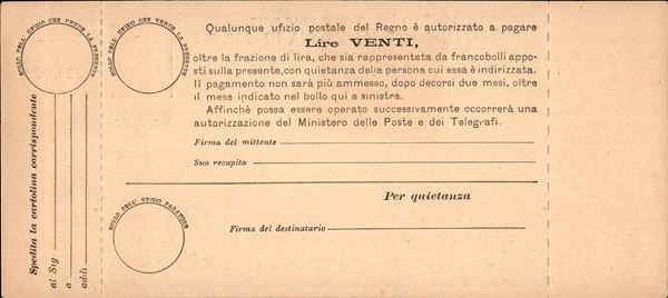 1890 - Saggi - Cartolina Vaglia 20 lire (SG13) - nuova