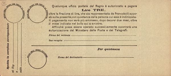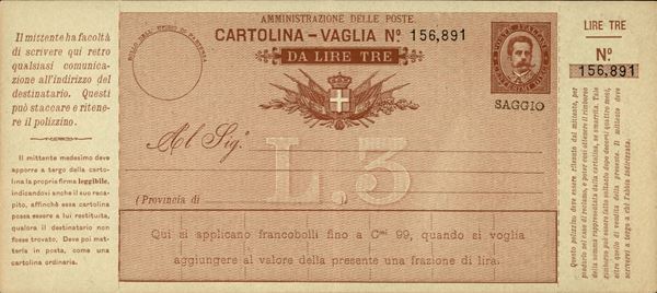 1890 - Saggi - Cartolina Vaglia 3 lire (SG4) - nuova