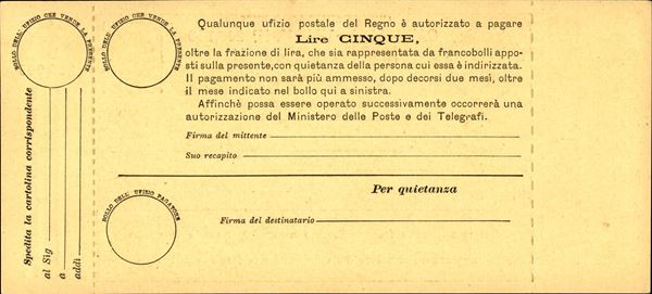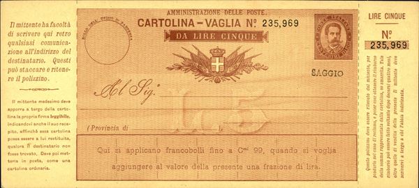 1890 - Saggi - Cartolina Vaglia 5 lire (SG6) - nuova