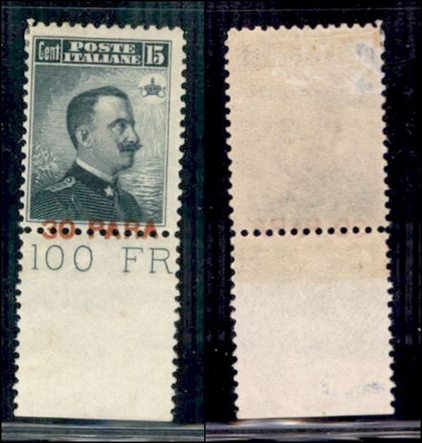 1908 - 30 para su 15 cent (15-varietà) bordo foglio - soprastampa obliqua solo in basso (a cavallo della dentellatura) - gomma originale - leggermente assottigliato in angolo in alto a sinistra - non catalogato