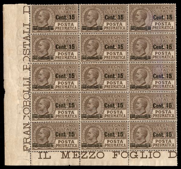 1924 - 15 cent su 10 Posta Pneumatica (4) - blocco di 15 angolo di foglio - gomma integra - ben centrati