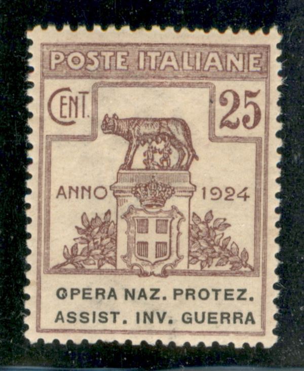 1924 - 25 cent Opera Naz. Protez. Assist. Inv. Guerra (52) - trattini nella O (non catalogato) - gomma originale con lieve traccia di linguella - ben centrato