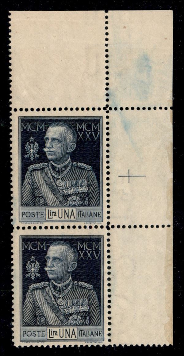 1925 - 1 lira Giubileo (187c) - filigrana lettere - coppia verticale angolo di foglio - gomma integra