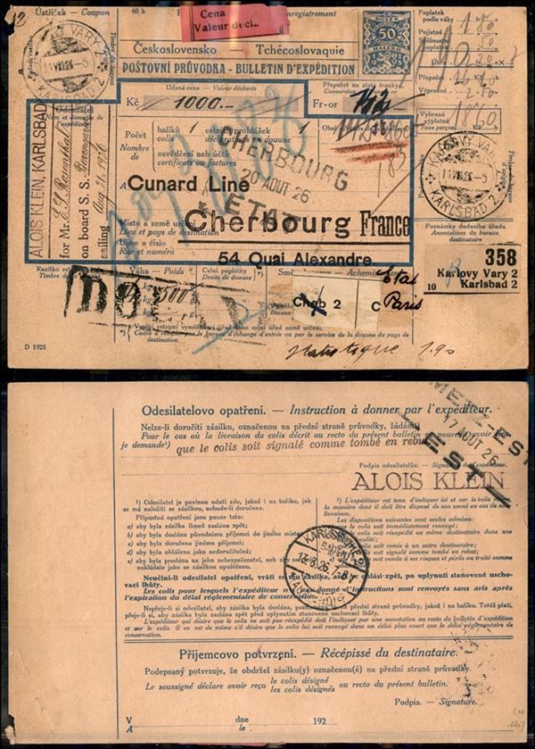 1926 - Bollettino pacchi per 50 haleru da Karlsbad a Cherbourg del 11.8.26 - transito in Germania - interessante la destinazione a bordo di una nave