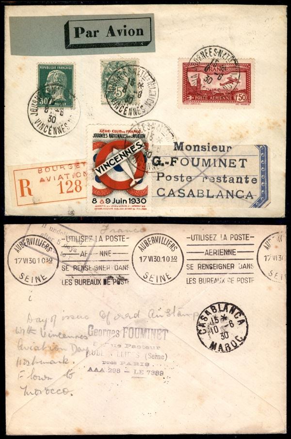 1930 (8 giugno) - Vincennes/Giornata Nazionale dell’Aviazione - aerogramma raccomandato per Casablanca
