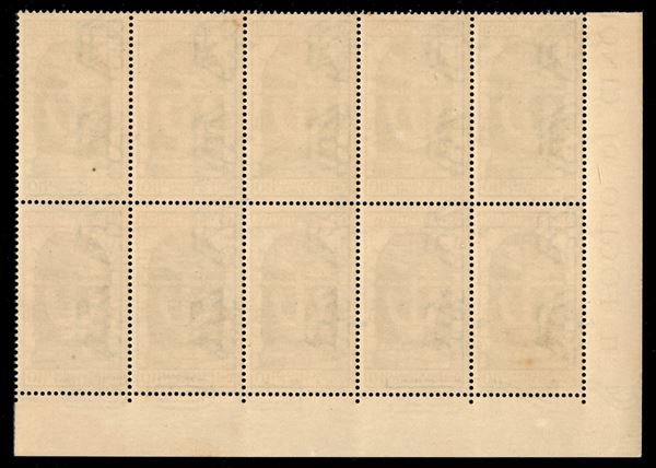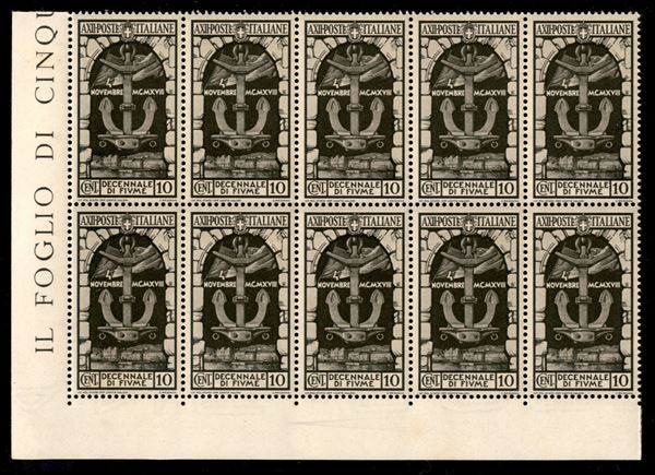 1934 - 10 cent Annessione Fiume (350) - blocco di 10 angolo di foglio - gomma integra