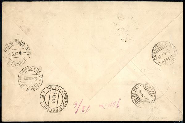 1948 (6/15 giugno) - aerogramma con affrancatura multipla - 6 valori con annulli delle tappe di Torino (5/6) + Bologna (5/6) + Rimini (6/6) + Napoli (7/6) + Roma (12/6) + Torino in arrivo (15/6)