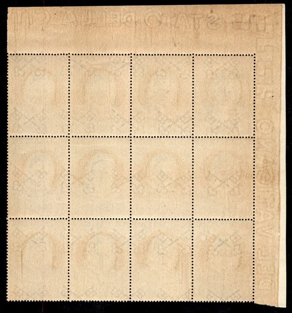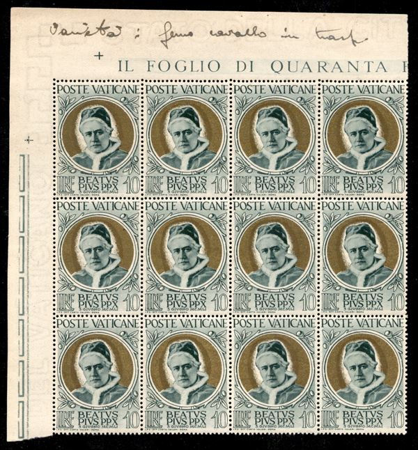 1951 - 10 lire Pio X (146a) con ritocco - blocco angolare di 12 - gomma intregra