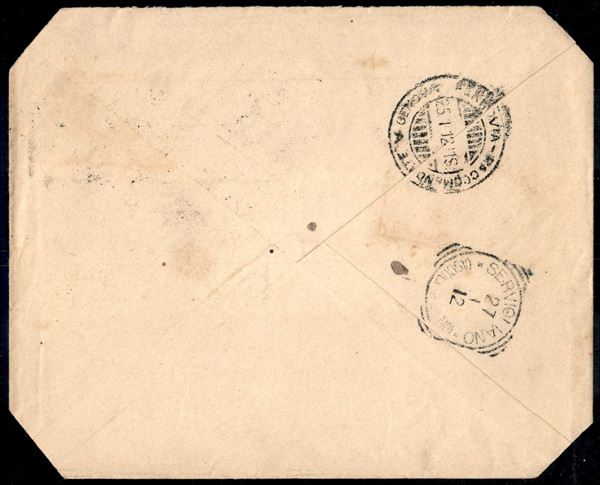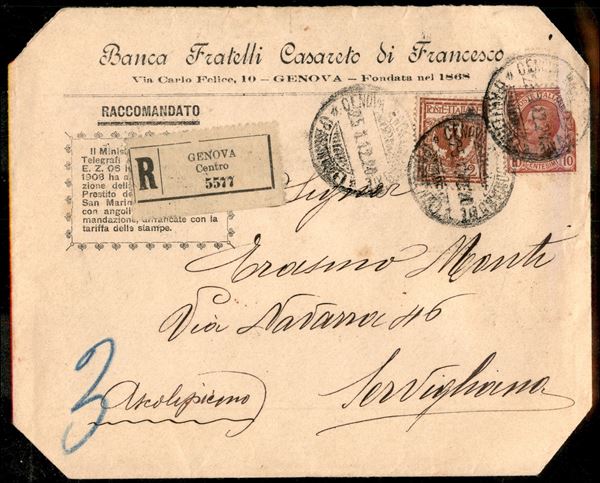 2 cent + 10 cent su busta speciale Banca Casareto da Genova per Servigliano del 25.1.12 - 10 cent con angolo asportato prima dell'applicazione - probabile frode postale - insieme non comune