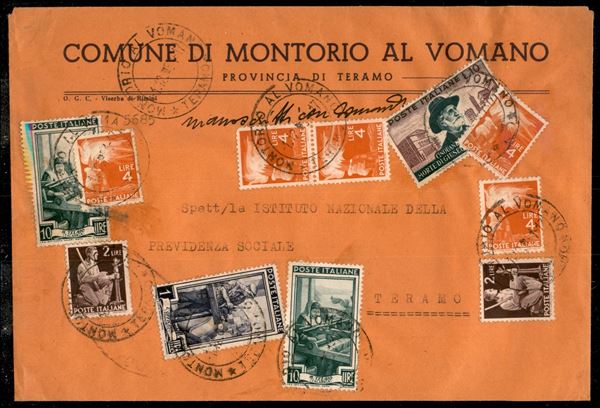 2 lire + cinque 4 lire Democratica + 1 lira + due 10 lire Italia al Lavoro + 10 lire Verdi (552 + 554 + 635 + 639 + 677) su busta da Montorio al Vomano per Teramo del 1.12.51