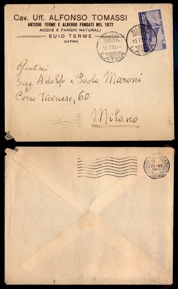 20 lire Ara Pacis (656) isolato su busta da Svio a Milano del 19.7.51