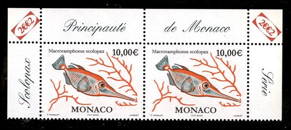 2002 - 10 euro Pesce Trombetta (2582) - coppia orizzontale angolo di foglio - gomma integra