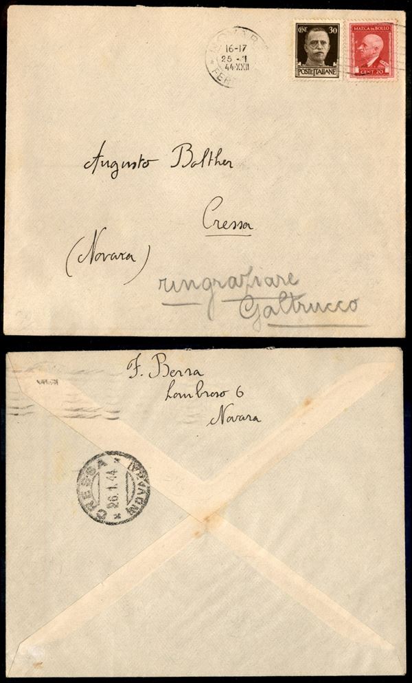 30 cent Imperiale (249) + 20 cent Marca da Bollo (22) - busta da Novara a Crema del 25.1.44