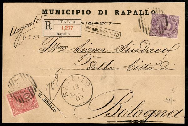 40 cent Vitt. Em. II + 50 cent Umberto I (20 + 42) su frontespizio di raccomandata tre porti da Rapallo per Bologna del 13. sett. 83