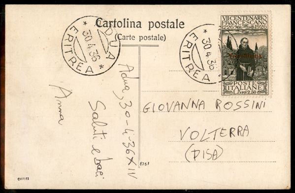 5 + 2,5 lire S. Francesco (32 - Tripolitania) su cartolina da Adua a Volterra del 30.4.36