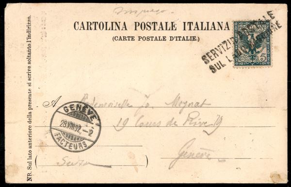 5 cent (70) con annullo nitido lineare su due righe Servizio Postale sul Lago Maggiore su cartolina per la Svizzera - bollo d'arrivo di Ginevra del 26 agosto 1902