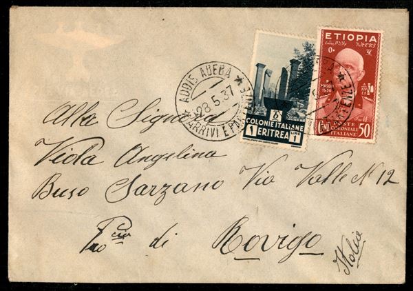 50 cent (5) + 1 lira (209 - Eritrea) - aerogramma da Addis Abeba a Rovigo del 28.5.37