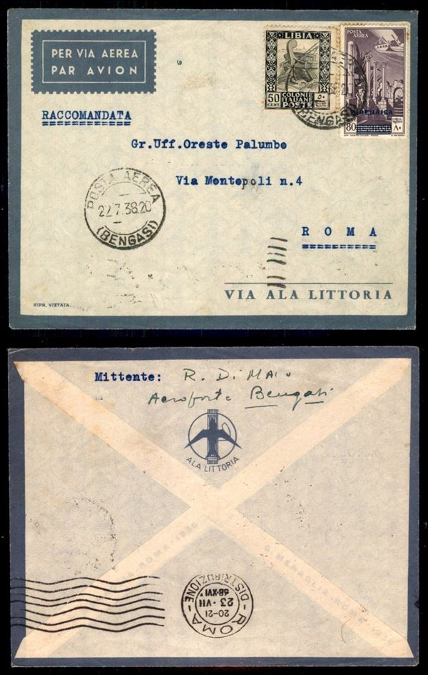 80 cent (3) + complementare (51 - Libia) - aerogramma da Bengasi a Roma del 22.7.38 (500+)