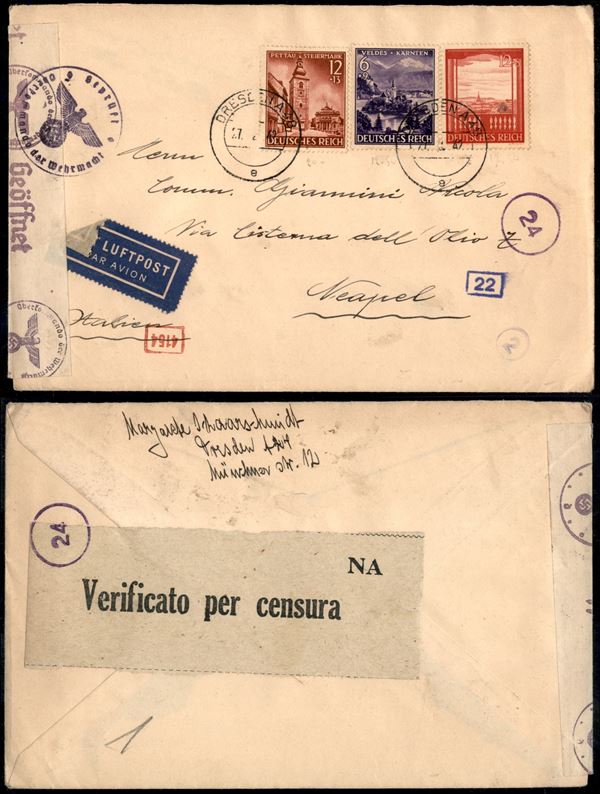 Aerogramma raccomandato da Dresdena a Napoli del 27.2.42 (804 + 807 + 808) - censure