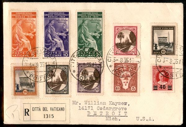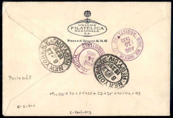 Affrancatura dieci colori Giardini e Medaglioni + Congresso Giuridico + Provvisoria 40 cent su 80 (19/20 + 22 + 24/25 + 27 + 35 + 41/43) su raccomandata per Detroit (USA) del 3.8.35