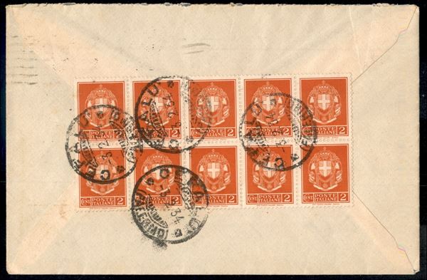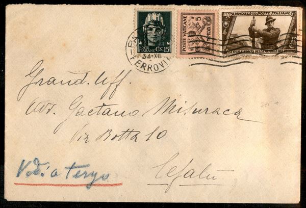 Affrancatura mista Italia Vaticano - dieci 2 cent applicati al verso e annullati in arrivo a Cefalù + 15 cent + 5 cent + Vaticano 5 cent (1) su lettera da Palermo a Cefalù del 2.2.34