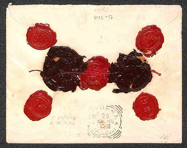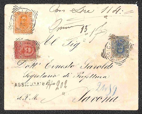 Assicurata lire 114 grammi 13 affrancata 10 cent + 20 cent + 25 cent (60/62) da Codigoro a Savona del 27 dic. 96