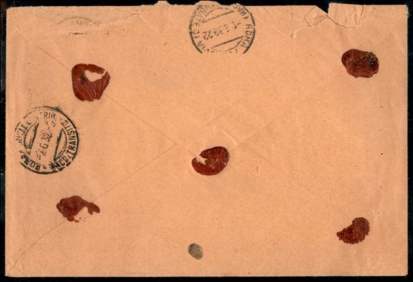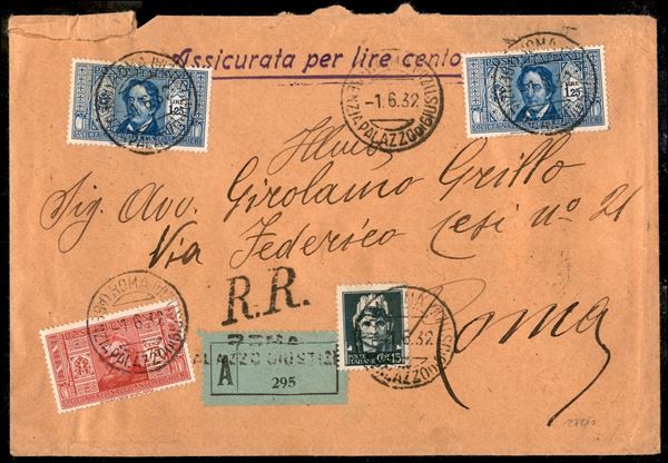 Assicurata lire cento per cittą affrancata 15 cent + 75 cent + due 1,25 lire (246 + 309/10) - annullo di agenzia Roma Agenzia Palazzo di Giustizia 1.6.32