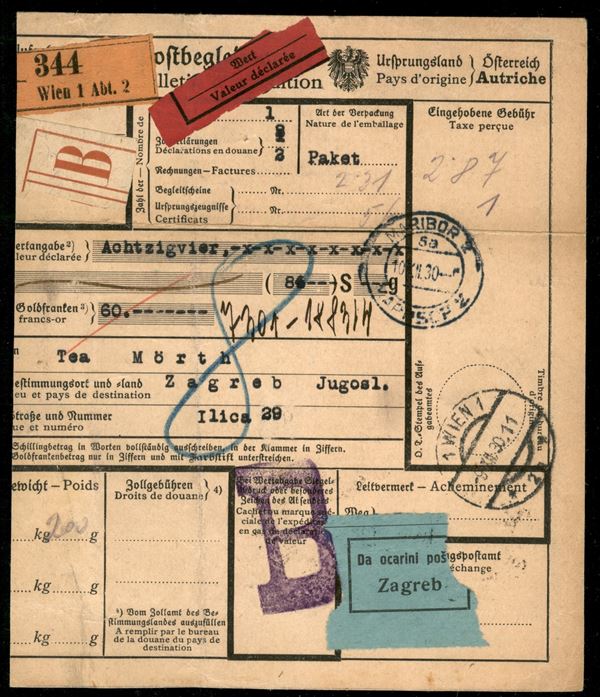 Bollettino di spedizione da Vienna a Zagabria del 9.12.30