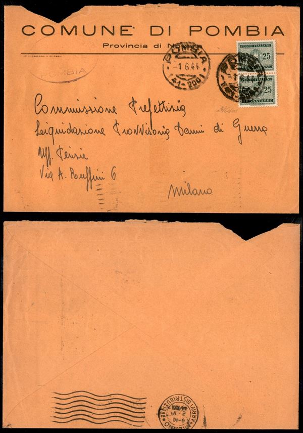 Busta da Pombia a Milano del 1.6.44 con affrancatura d'emergenza (Segnatasse 37 coppia) - Savarese