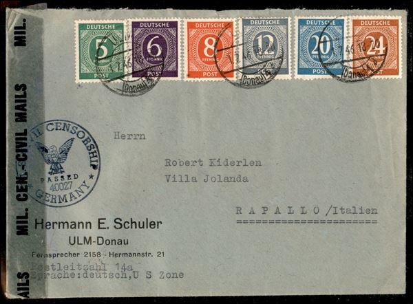Busta da Ulmh a Rapallo del 1.7.46 - censura (915/917 + 919 + 924/925)