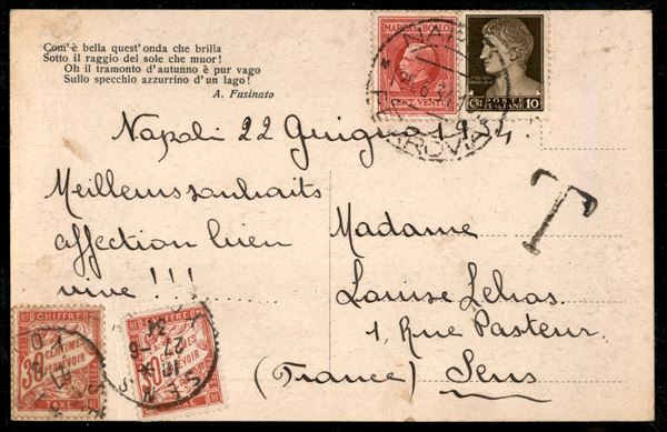 Cartolina per la Francia con 10 cent Imperiale + 20 cent Marca da Bollo da Napoli Ferrovia 25.6.34 - bollo T grande e tassata in arrivo con due 30 cent Segnatasse di Francia