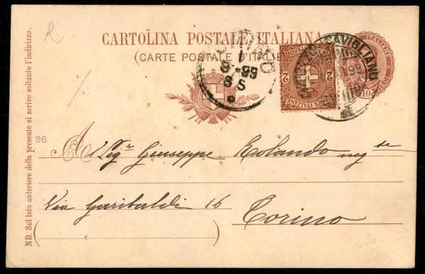 Cartolina Postale 10 cent effigie ovale mill. 98 affrancata in tariffa campione senza valore con Umberto I 2 cent (66) annullo ambulante Saluzzo-Savigliano 1 mar. 99 (C259