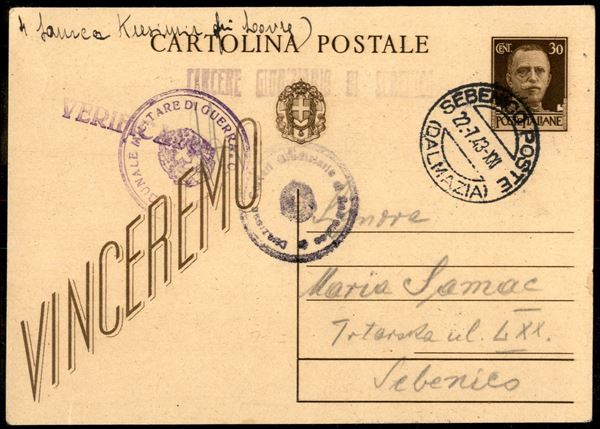 Cartolina postale 30 cent Vinceremo da Sebenico Poste (Dalmazia) 22.7.43 con timbro Carcere Giudiziario di Sebenico e bolli di censura