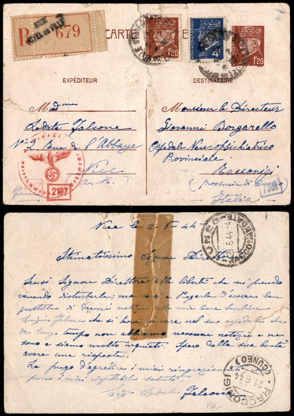Cartolina postale da 1,20 franchi (con complementari) raccomandata da Nizza a Racconigi del 2.6.44 - difetti - da esaminare