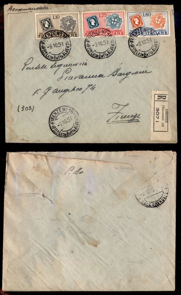Centenario Sardegna (672/674) - serie completa su raccomandata per cittą - Firenze 8.10.51