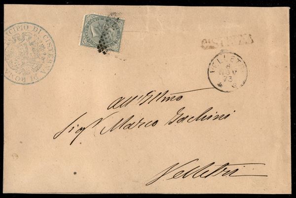 Cisterna (Pti 6) - 5 cent Torino (T16) difettoso su involucro di busta per Velletri del 11.73