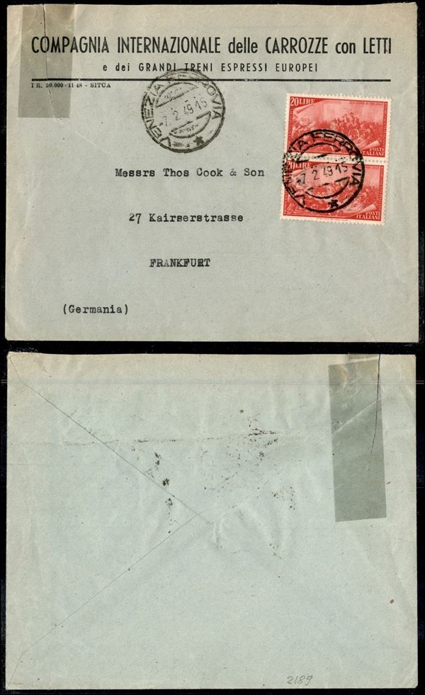 Coppia del 20 lire Risorgimento (588) - busta da Venezia a Francoforte del 7.2.49