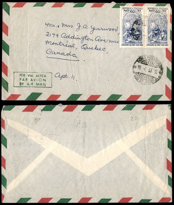 Coppia del 60 lire Leonardo (687) su aerogramma da Roma al Canada del 10.7.53