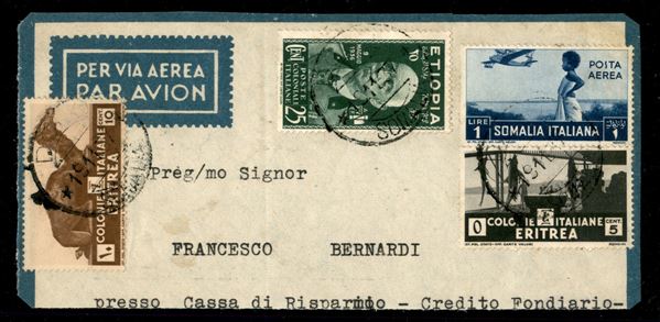 Dolo 19.11.37 (pti 10) su testatina di aerogramma con affrancatura mista Eritrea + Etiopia + Somalia