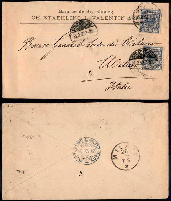Due 20 pfennig (48) su busta da Strasburgo a Milano del 25.2.92