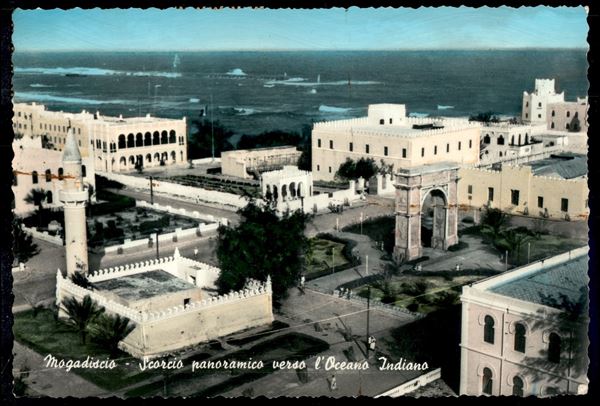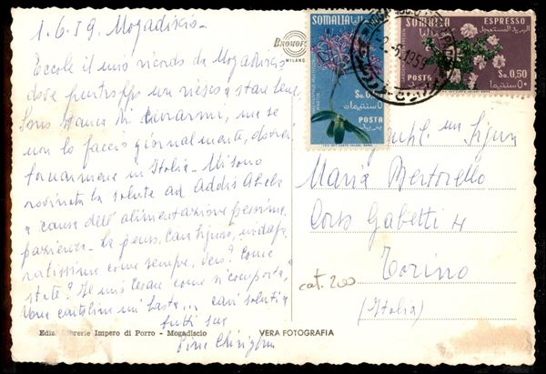 Due cartoline via aerea per l'Italia con affrancature diverse - 55 lire Soggetti africani (8) e 5 cent Fiori (28) + 50 cent Espresso (3)