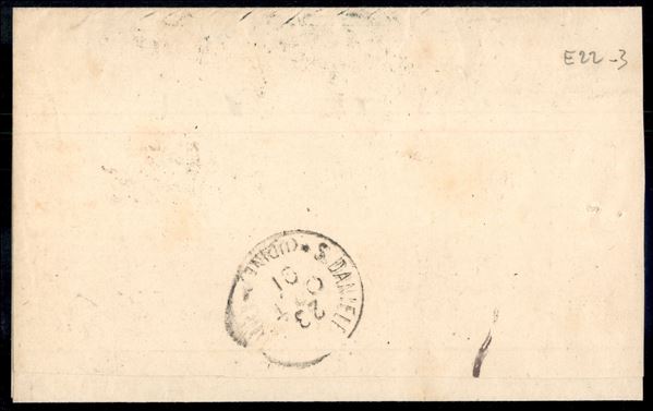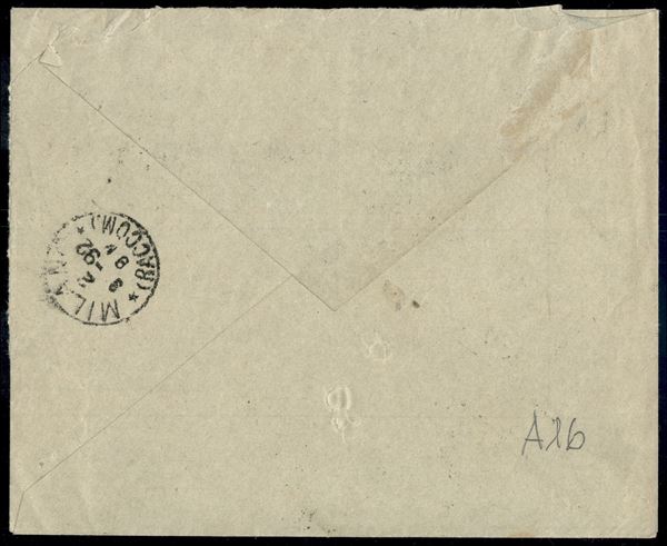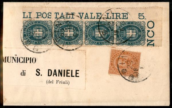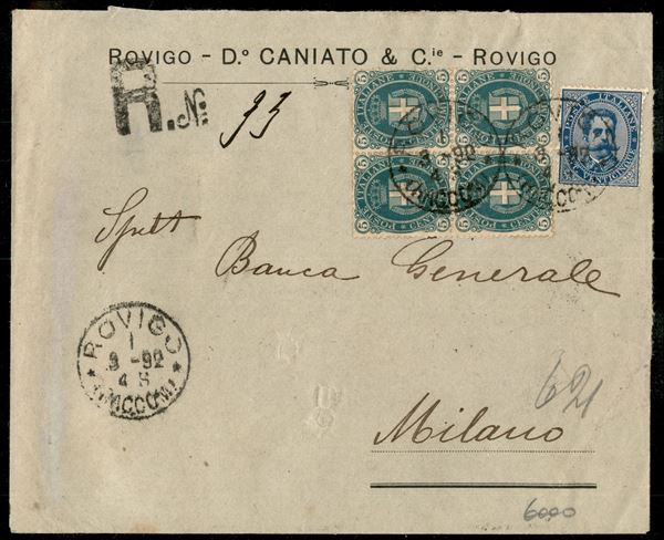 Due lettere affrancate 5 cent - una in doppio porto con striscia verticale di quattro + 20 cent (44 + 39) e l'altra raccomandata con quartina + 25 cent (44 + 40)