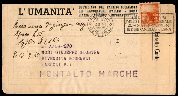 Estratto conto giornali con 4 lire Democratica (554) - da Roma per Montalto Marche del 30.6.1948