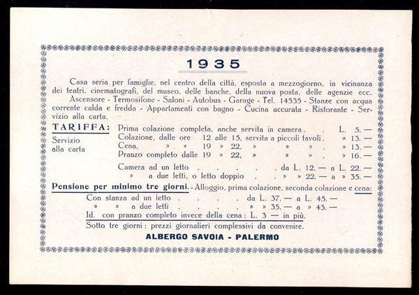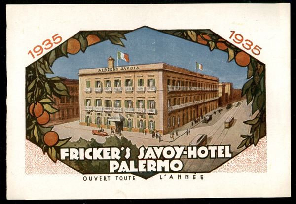 Fricker's Savoy-Hotel Palermo - 1935 tariffario informativo al retro in italiano