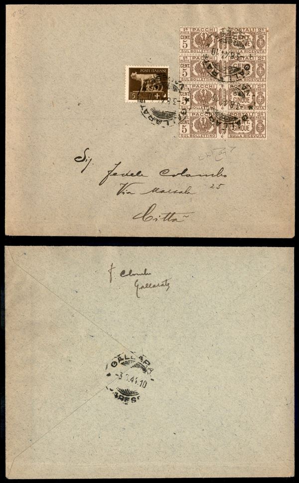 Gemelli - 5 cent Imperiale (243) + striscia di quattro del 5 cent Pacchi Postali (24) - busta per cittą - Gallarate 3.8.44 - Raybaudi