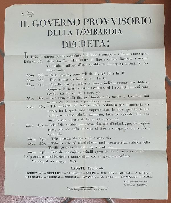 Governo Provvisorio della Lombardia - Decreto sul dazio d'entrata per Lino e Canapa - Manifesto (60x40) - Milano 25 maggio 1848