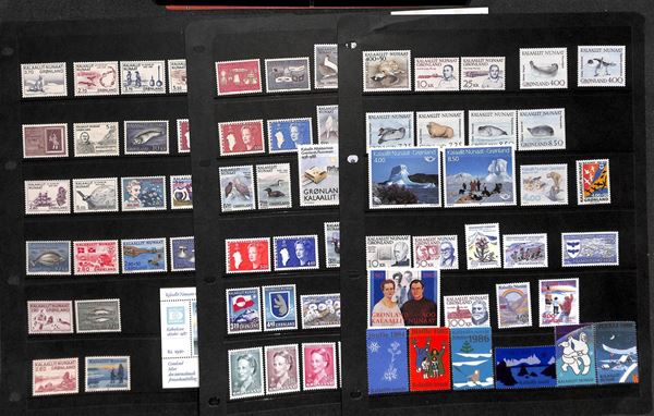 GROENLANDIA - 1984/1992 - Collezione completa di valori e serie del periodo in fogli di raccoglitore - gomma integra (200+)