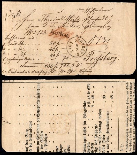 Impero Austro Ungarico - Ricevuta di lettera con denaro da Nagy a Szombat a Pressburg del 6.9.68