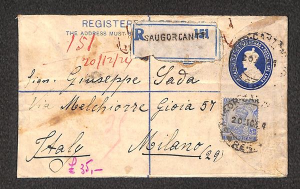 Intero Postale 2 annas + 3 annas (Mich. 104a) – raccomandata da Saugorcantt a Milano del 20.12.24